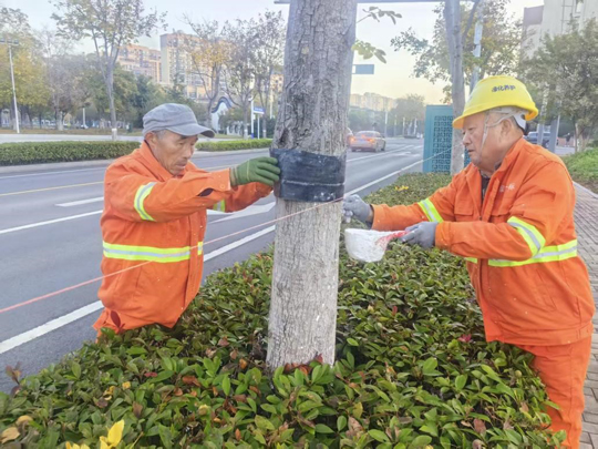 隨著氣溫逐步降低,建發(fā)公司全面啟動(dòng)樹木涂白工作,為道路、公園、廣場及景觀帶的喬灌木穿上抗凍防寒、抵御病蟲害的“防護(hù)衣”,以保障其安全越冬,提高保存率,進(jìn)一步擦亮城市生態(tài)底色。